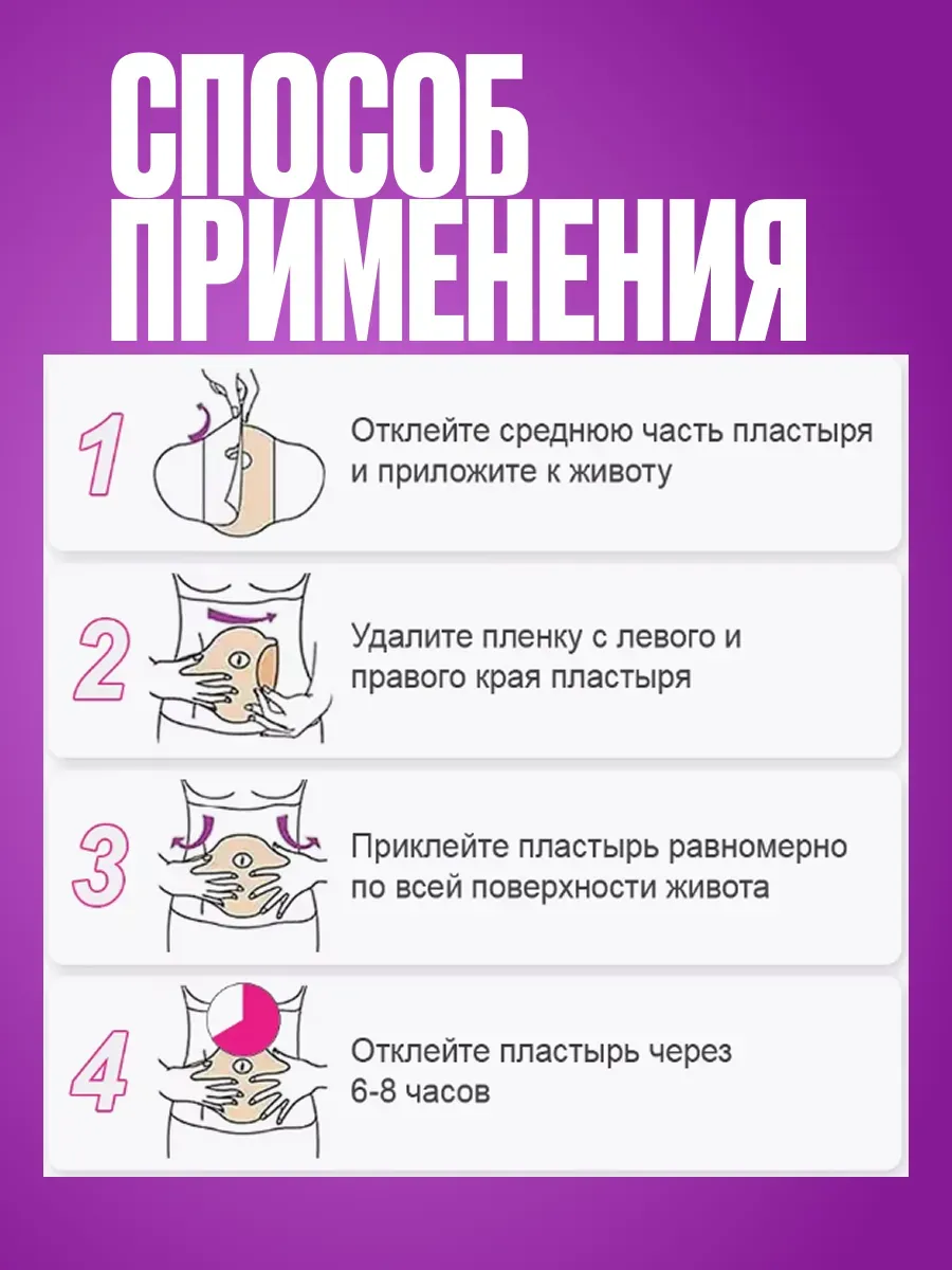 ● Удобство и простота: Встройте уход в свой привычный ритм. Просто наклейте пластырь на зону талии и живота и продолжайте заниматься своими делами.